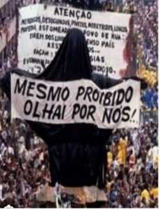 É quando vejo chegando o voluntário Luiz com um estandarte em forma de cruz, coberto com saco plástico preto e uma faixa com os dizeres “Mesmo proibido, olhai por nós” que reconheço de imediato e peço para fotografar. Esta é uma frase histórica do Carnaval de 1989, usada pela Escola de Samba Beija-Flor de Nilópolis no carro abre-alas cujo título é Cristo Mendigo. O carro foi censurado a pedido do Arcebispo do Rio de Janeiro à época e o carnavalesco Joãosinho Trinta, com imensa criatividade e ousadia, cobriu a imagem proibida do Cristo com sacos de lixo pretos estampando a frase “Mesmo proibido olhai por nós” como protesto contra a censura e contra a exclusão social. O enredo da Beija-Flor nesse ano era “Ratos e Urubus, Larguem a Minha Fantasia”, focando nos marginalizados e no lixo, celebrando a estética da rua e a superação. Luiz foi inspirado e inspirador.